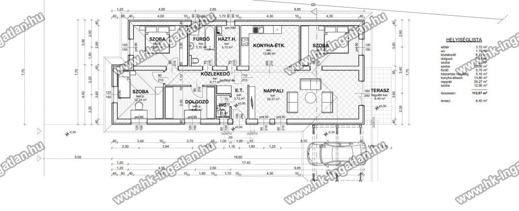 Az ingatlanok elrendezése kiváló: 112 nm hasznos alapterület (+ 8 nm terasz), nappali + 4 szoba, dupla-komfortos kialakítással, lakásonként nagy telekrészekkel (1-es lakás kb. 600 nm, 2-es lakás kb. 690 nm).