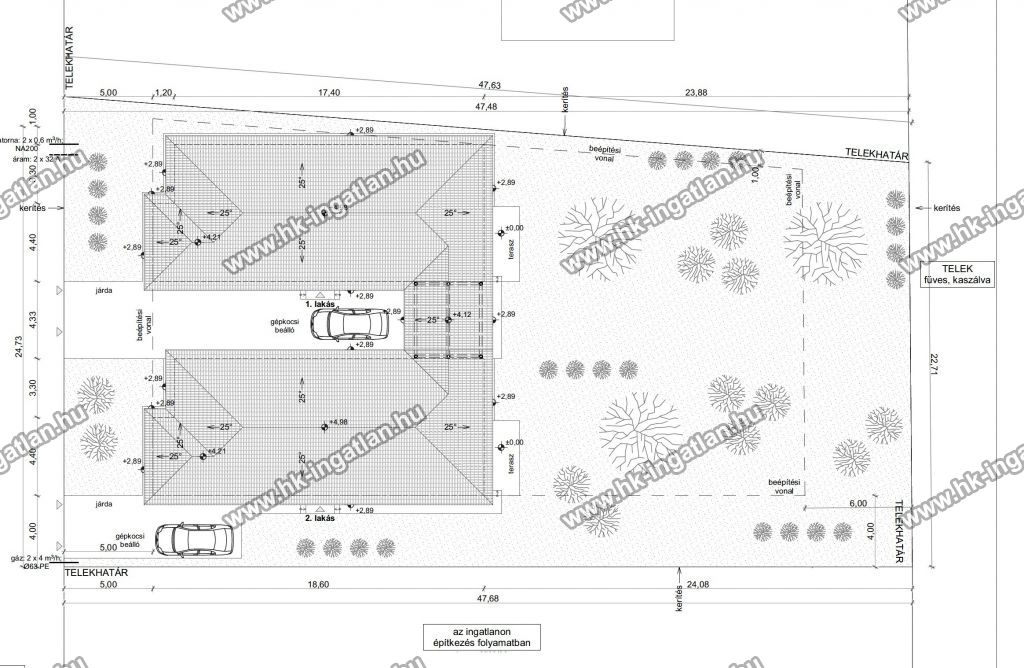 Az ingatlanok csak a fedett beállónál érintkeznek, közös faluk nincs!