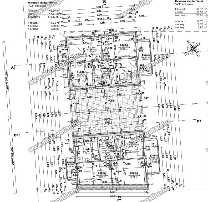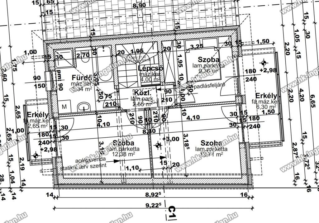 Az emelet 50,33 nm + 2 erkély: 3 hálószoba (mindegyik erkélykapcsolatos), fürdőszoba káddal, közlekedő