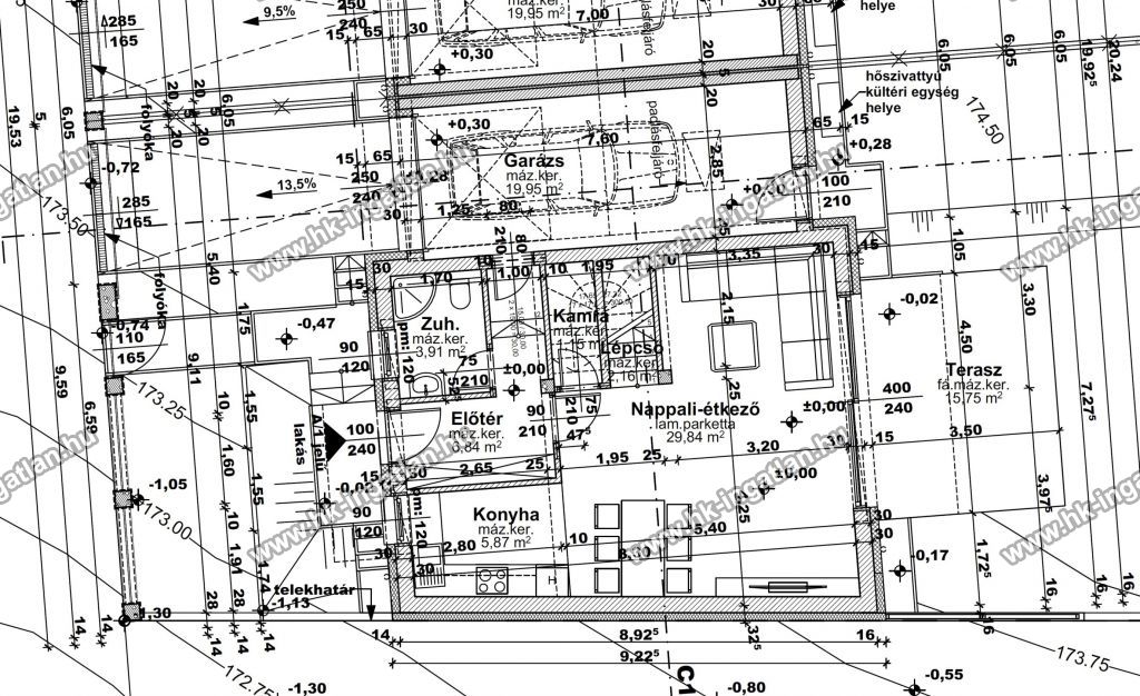 A földszint 69,72 nm a garázzsal + terasz: amerikai konyhás nappali + fürdőszoba zuhanyzóval + kamra + előtér + terasz