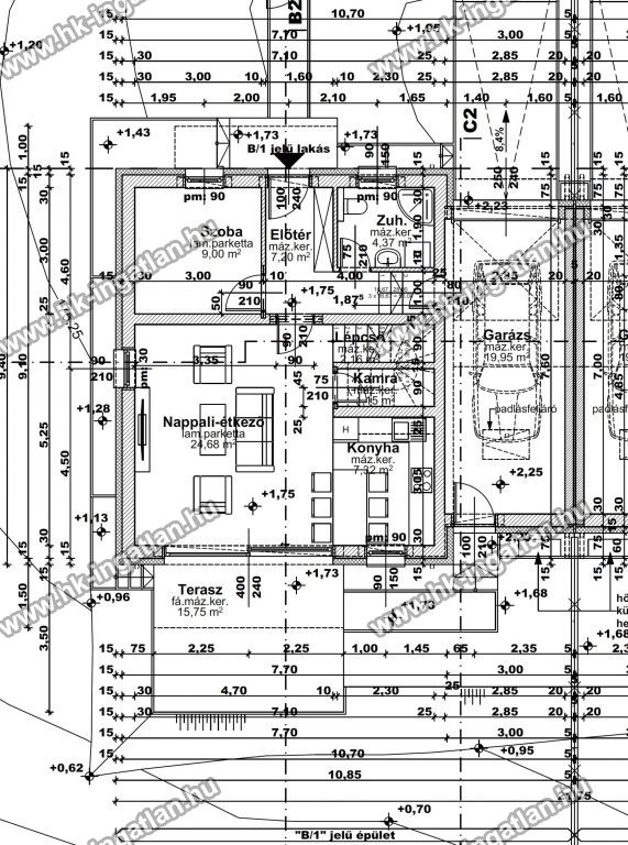 A földszint 75,83 nm a garázzsal + terasz: amerikai konyhás nappali + fürdőszoba zuhanyzóval + kamra + előtér + terasz