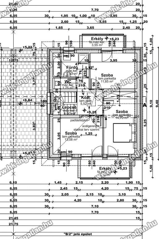 Az emelet 57 nm + 2 erkély: 3 hálószoba (mindegyik erkélykapcsolatos), fürdőszoba káddal, közlekedő